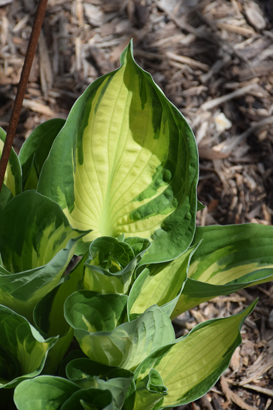 Deep green margins surround creamy white centers in spring that mature to light green then finally dark green in late summer; spikes of pale lavender flowers in mid to late summer; a whirlwind of change in the garden or border.