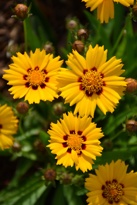 Sunfire Tickseed is smothered in stunning yellow daisy flowers with gold eyes and a burgundy ring at the ends of the stems from late spring to late summer. The flowers are excellent for cutting. Its narrow leaves remain emerald green in color throughout the season.