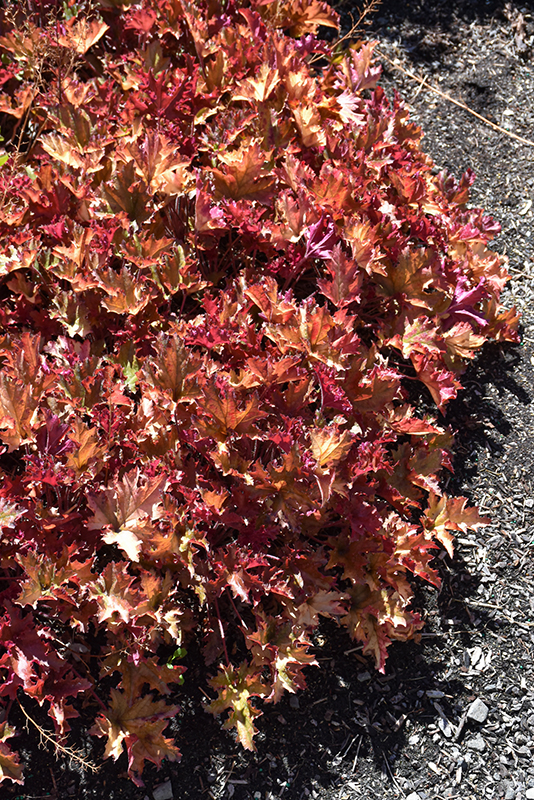 Heavily ruffled, glossy foliage emerges orange and matures to copper, with bright magenta undersides; dainty white bells ascend in summer; an outstanding foliage color addition with great versatility; keep soil moist in heat of summer.