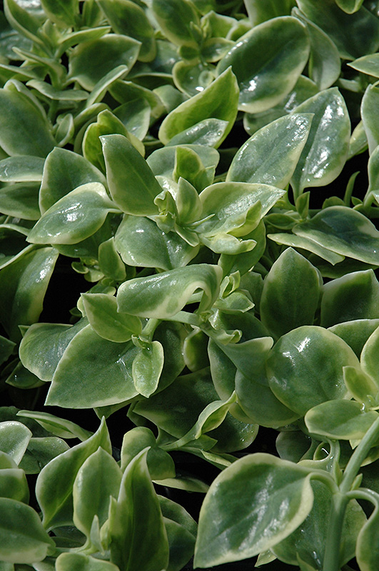 This trailing succulent variety features glossy blue-green foliage with creamy margins; rose-red daisy like flowers from late spring until fall; great for containers and baskets or as a sunny garden groundcover