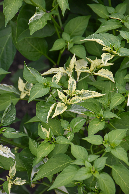 Fish Ornamental Pepper is primarily grown for its highly ornamental fruit. The fruits are showy green peppers with creamy white stripes and which fade to red over time, which are carried in abundance from mid summer to early fall. Its attractive pointy leaves remain green in color with showy white variegation and tinges of grayish green throughout the season. It features subtle white star-shaped flowers dangling from the stems from early to late summer.