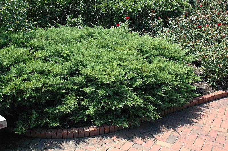 A very horizontal and compact form of Pfitzer juniper with richly green and extremely soft foliage throughout the season, very fine texture, habit tends to spray outwards along the ground; a superb choice for a bright green groundcover