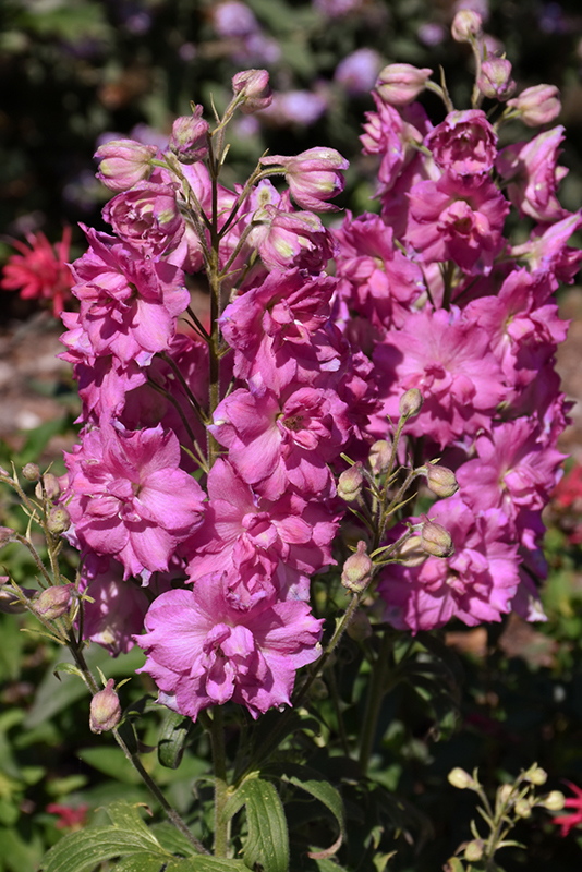 Pink Punch Larkspur will grow to be about 3 feet tall at maturity extending to 5 feet tall with the flowers, with a spread of 24 inches. When grown in masses or used as a bedding plant, individual plants should be spaced approximately 18 inches apart. It tends to be leggy, with a typical clearance of 1 foot from the ground, and should be underplanted with lower-growing perennials. The flower stalks can be weak and so it may require staking in exposed sites or excessively rich soils. It grows at a medium rate, and under ideal conditions can be expected to live for approximately 10 years. As an herbaceous perennial, this plant will usually die back to the crown each winter, and will regrow from the base each spring. Be careful not to disturb the crown in late winter when it may not be readily seen!