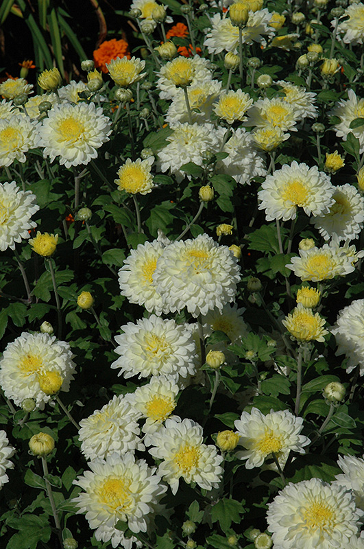 Morden Cameo Chrysanthemum is smothered in stunning fully double creamy white daisy flowers with buttery yellow overtones at the ends of the stems from early to late fall. The flowers are excellent for cutting. Its fragrant ferny leaves remain green in color throughout the season.