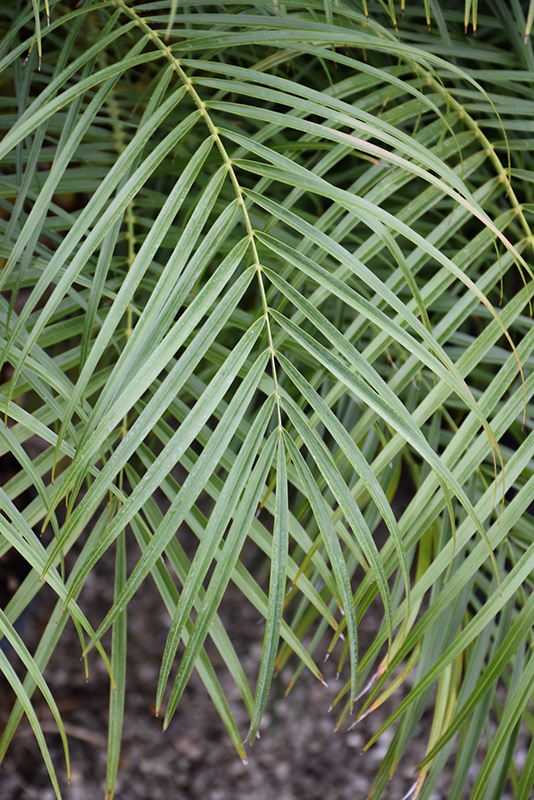 Pygmy Date Palm's attractive narrow pinnately compound leaves remain bluish-green in color throughout the year on a plant with the bulk of the canopy held atop a towering trunk or stem. It has panicles of yellow flowers hanging below the branches in mid summer.