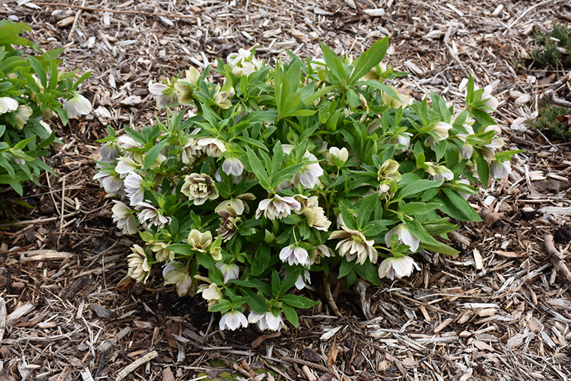 Wedding Party® Confetti Cake Hellebore features showy nodding double white cup-shaped flowers with burgundy spots at the ends of the stems from late winter to early spring. Its glossy oval compound leaves remain green in color throughout the year.