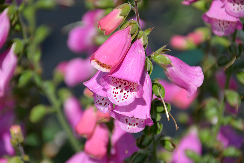 Pink Panther® Foxglove will grow to be about 22 inches tall at maturity extending to 30 inches tall with the flowers, with a spread of 22 inches. When grown in masses or used as a bedding plant, individual plants should be spaced approximately 18 inches apart. It tends to be leggy, with a typical clearance of 1 foot from the ground, and should be underplanted with lower-growing perennials. It grows at a fast rate, and tends to be biennial, meaning that it puts on vegetative growth the first year, flowers the second, and then dies. As an herbaceous perennial, this plant will usually die back to the crown each winter, and will regrow from the base each spring. Be careful not to disturb the crown in late winter when it may not be readily seen!