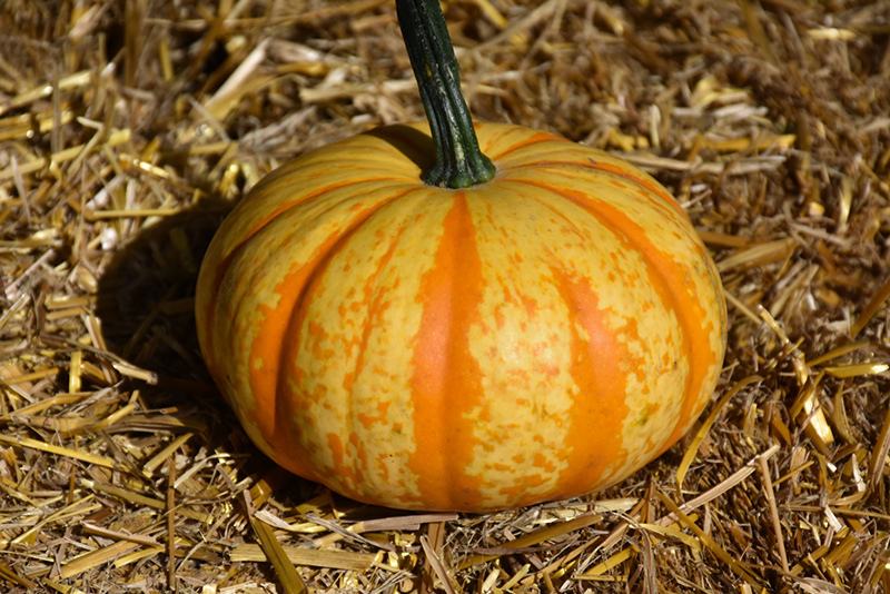 Decorative and delicious, this variety stands out in gardens; produces small bright yellow pumpkins with orange stripes and spots; the smooth textured, sweet and nutty flesh is ideal for roasting, baking, and stuffing; lovely addition to harvest displays