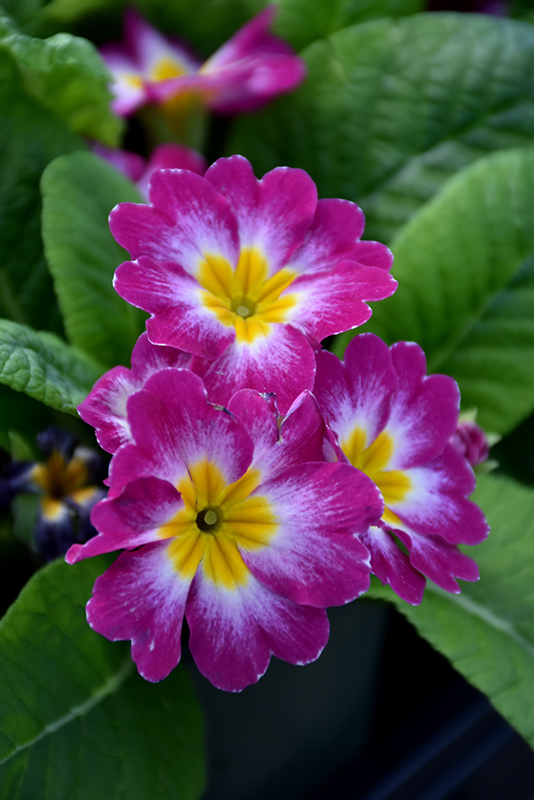 Danova Wine Bicolor Primrose features delicate clusters of burgundy round flowers with white overtones and gold eyes rising above the foliage from early spring to early fall. Its oval leaves remain dark green in color throughout the year.