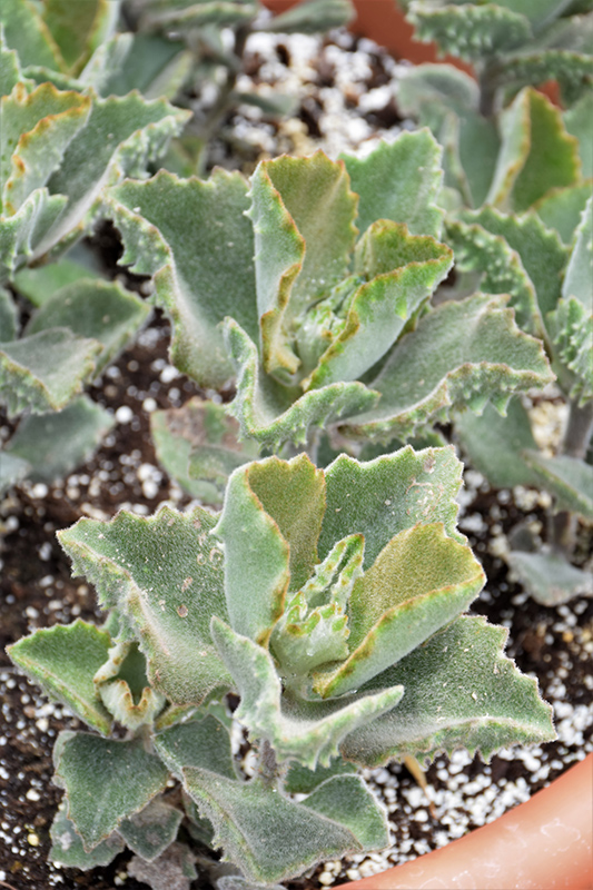 An upright, slow growing succulent, featuring velvety rounded leaves with fang-like tubercles on the backsides, and copper spots along the margins foliage is golden-brown in sun and silver-gray in shade; great for containers and rock gardens