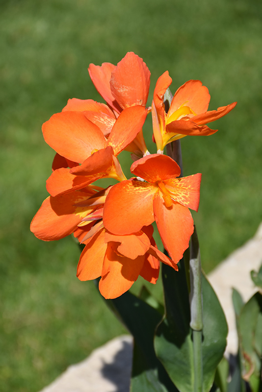 Orange Punch Canna features bold spikes of orange flag-like flowers with gold centers at the ends of the stems from early summer to early fall. Its attractive large glossy pointy leaves remain bluish-green in color throughout the year.