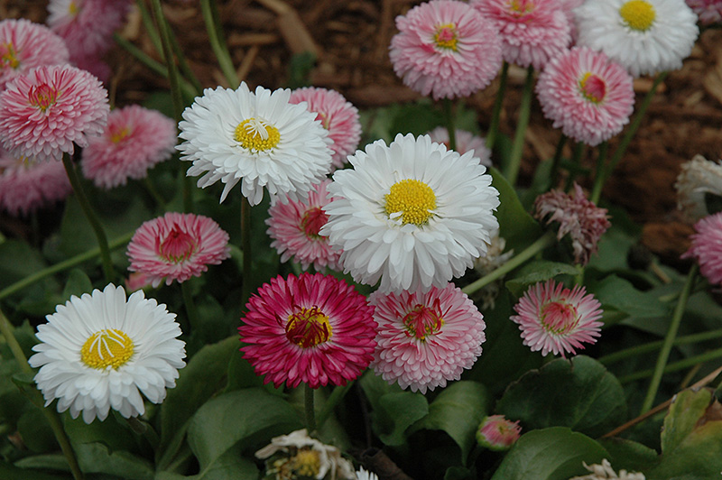 Bright Carpet Mix English Daisy features delicate fully double pink button flowers with white overtones, yellow eyes and rose tips at the ends of the stems from mid spring to early summer. The flowers are excellent for cutting. Its glossy oval leaves remain dark green in color throughout the season.