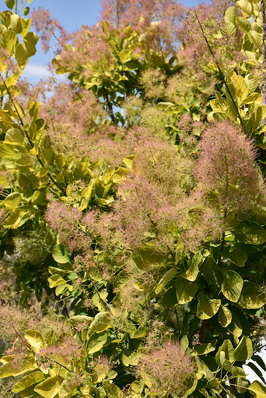 An exciting new color accent for the garden, this shrub features rich yellow foliage across the entire season, finally turning a striking mix of amber, coral and scarlet in fall; smoky, airy flowers are similar to other varieties and quite effective