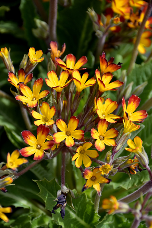 Oakleaf Yellow Picotee Primrose features delicate clusters of yellow star-shaped flowers with gold eyes and ruby-red tips rising above the foliage from early to late spring. Its lobed leaves remain dark green in color throughout the year.