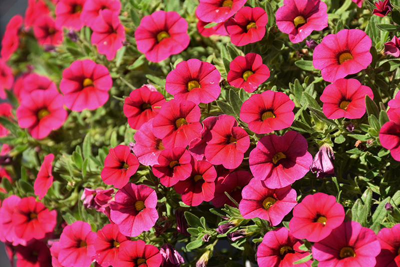 Cabaret® Hot Rose Calibrachoa is clothed in stunning rose trumpet-shaped flowers with yellow throats at the ends of the stems from late spring to early fall. Its small pointy leaves remain green in color throughout the season.