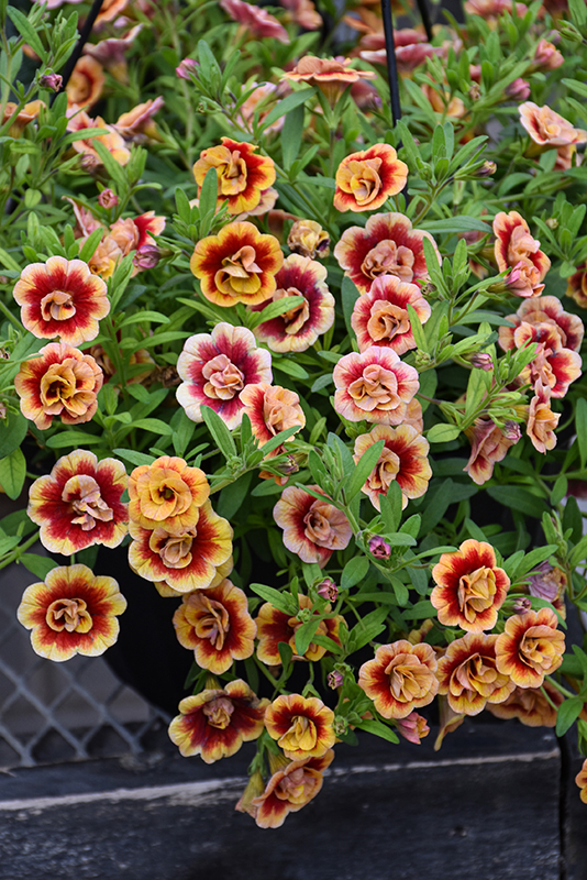 MiniFamous® Neo Double OrangeTastic Calibrachoa is smothered in stunning double peach trumpet-shaped flowers with orange overtones, yellow throats and scarlet centers at the ends of the stems from late spring to early fall. Its small pointy leaves remain green in color throughout the season.