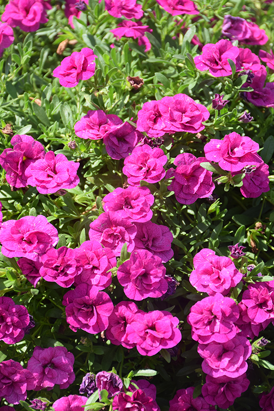 MiniFamous® Neo Double Purple Calibrachoa is smothered in stunning double fuchsia trumpet-shaped flowers at the ends of the stems from late spring to early fall. Its small pointy leaves remain green in color throughout the season.