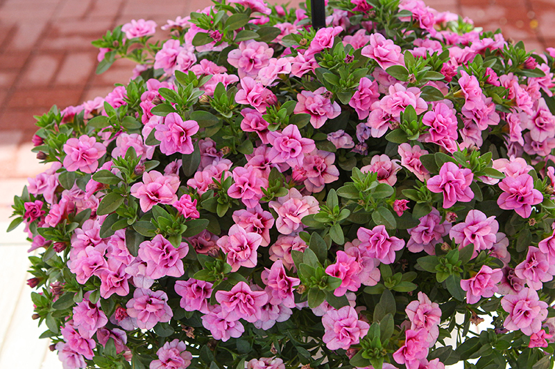 MiniFamous® Uno Double Light Pink Calibrachoa is smothered in stunning double shell pink trumpet-shaped flowers at the ends of the stems from late spring to early fall. Its small pointy leaves remain green in color throughout the season.