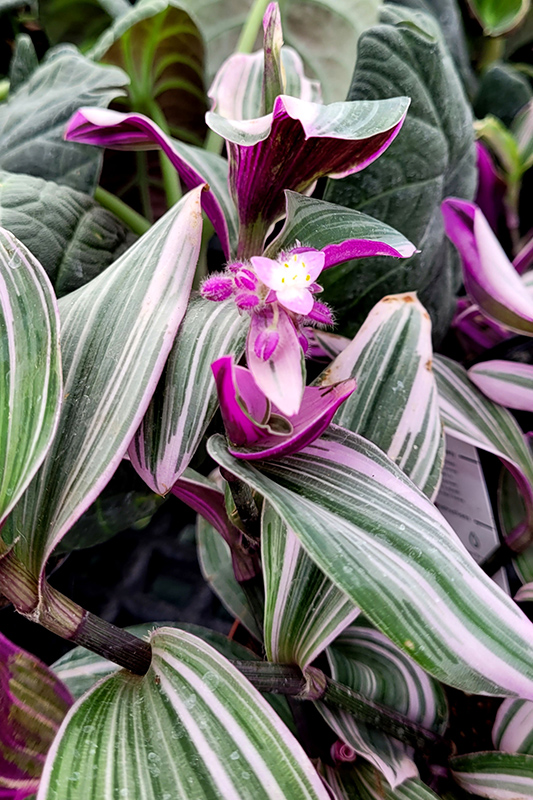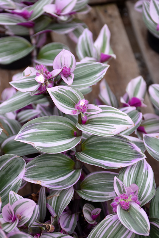 This trailing tropical is grown for its foliage; emerging purple leaves mature to green, with white stripes and violet reverses; low maintenance, and excellent for indoor containers or hanging baskets in bright areas