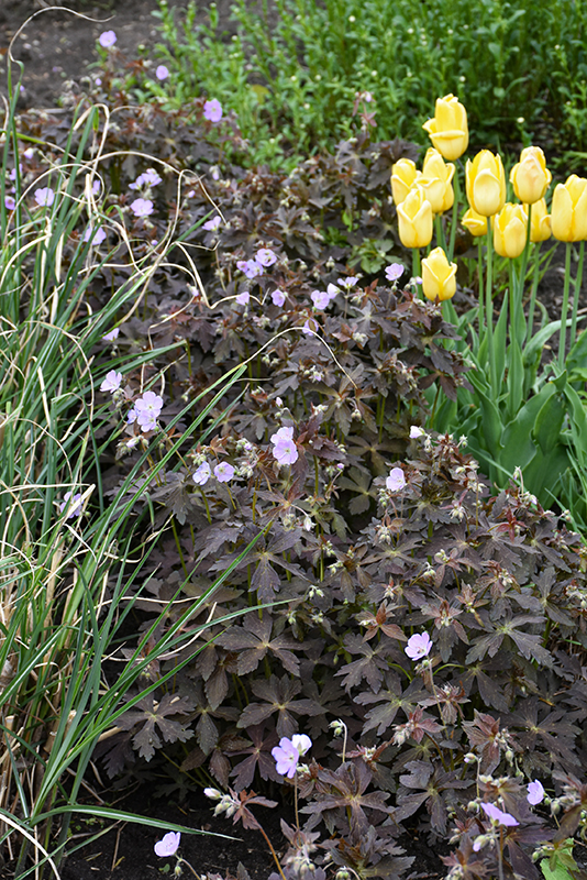 This is a compact clump forming perennial with unusual chocolate-brown foliage, turning bright red in the fall; vibrant blue, saucer-shape flowers contrast boldly with the foliage in late spring to mid-summer