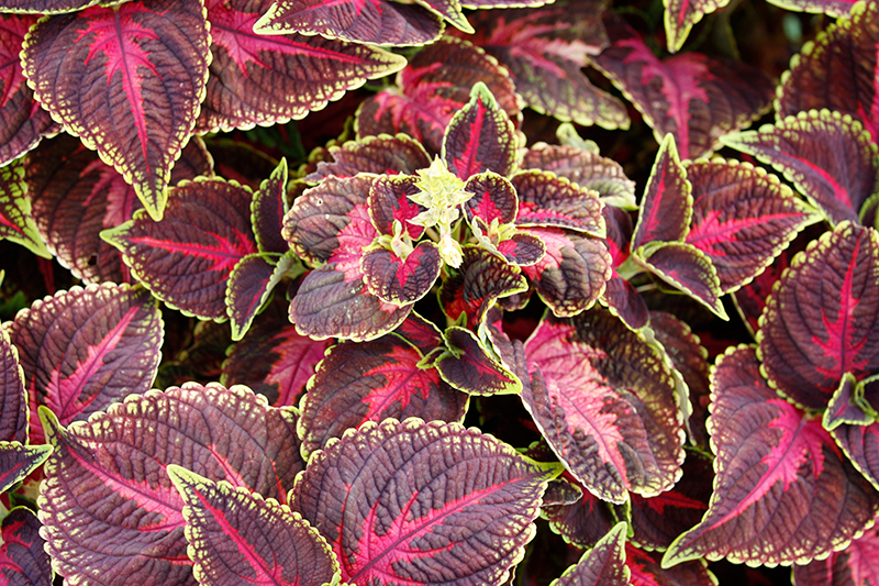 Main Street™ Orchard Road Coleus' attractive serrated pointy leaves remain dark brown in color with distinctive lime green edges and tinges of scarlet throughout the season on a plant with an upright spreading habit of growth.