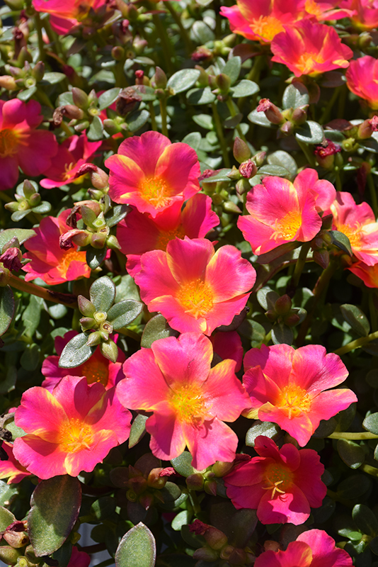 Mega Pazzaz™ Pink Twist Portulaca features showy pink cup-shaped flowers with yellow eyes and yellow streaks at the ends of the stems from late spring to early fall. Its tiny succulent oval leaves remain green in color throughout the season.