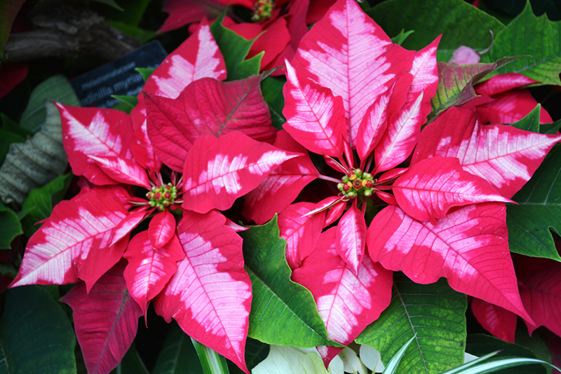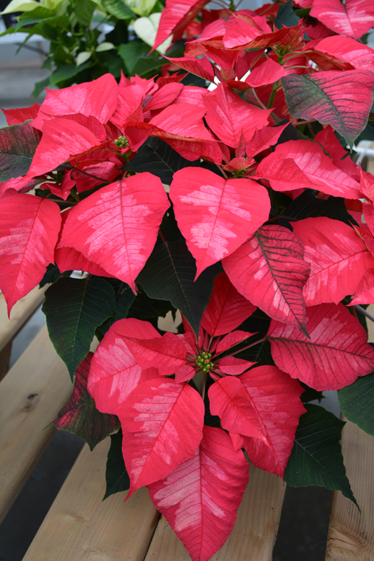 Poinsettias are bred and grown to be indoor plants, which generally results in dense, shrubby, multi-stemmed plants with a rounded yet upright habit of growth. They are characterized by the ring of showy bracts at the terminal ends of most branches, which are their primary feature of interest. Ice Punch Poinsettia features showy cherry red flat-top flowers with shell pink centers at the ends of the branches from early to late winter. The "flowers" are actually comprised of a showy ring of colored bracts (modified leaf structures) surrounding the true lemon yellow inflorescence in the center. Its pointy leaves remain dark green in color throughout the season. Since you are not expected to grow this plant out from the way that you purchase it from the store, what you see is more or less what you get for the duration of its functional life.