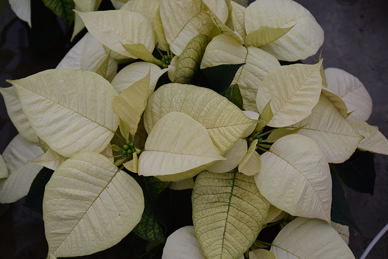 Poinsettias are bred and grown to be indoor plants, which generally results in dense, shrubby, multi-stemmed plants with a rounded yet upright habit of growth. They are characterized by the ring of showy bracts at the terminal ends of most branches, which are their primary feature of interest. Premium Polar Poinsettia is clothed in stunning creamy white flat-top flowers at the ends of the branches from early to late winter. The "flowers" are actually comprised of a showy ring of colored bracts (modified leaf structures) surrounding the true chartreuse inflorescence in the center. Its pointy leaves remain forest green in color throughout the season. Since you are not expected to grow this plant out from the way that you purchase it from the store, what you see is more or less what you get for the duration of its functional life.