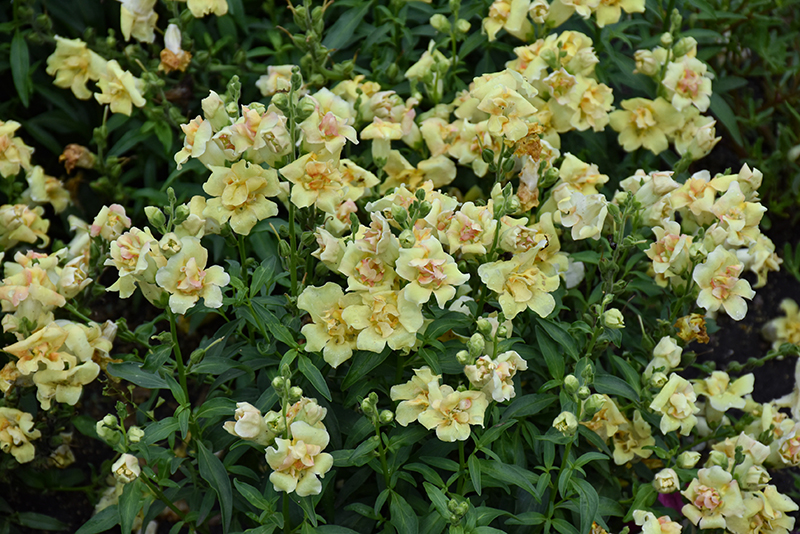 DoubleShot™ Yellow Red Heart Snapdragon has masses of beautiful spikes of lightly-scented double yellow pea-like flowers with creamy white overtones and red eyes rising above the foliage from mid spring to mid fall, which are most effective when planted in groupings. The flowers are excellent for cutting. Its small pointy leaves remain green in color throughout the season.