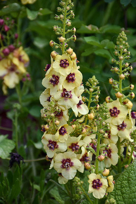 Dark Eyes Mullein has masses of beautiful spikes of buttery yellow flowers with dark red eyes rising above the foliage from mid spring to mid summer, which are most effective when planted in groupings. The flowers are excellent for cutting. Its crinkled oval leaves remain grayish green in color throughout the season.
