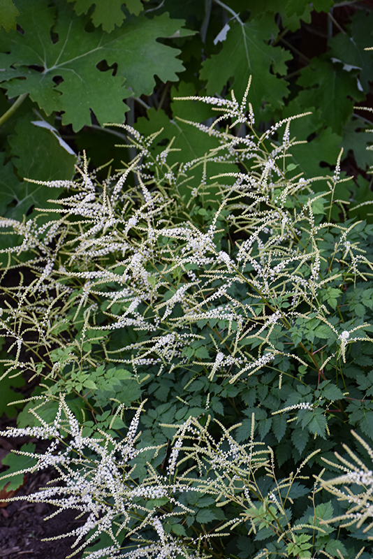 Showy, creamy white plume-like flowers on reddish stems; this compact plant has attractive ferny foliage; it does great in moist areas of the garden and doesn't like to dry out