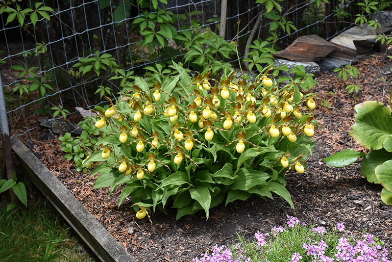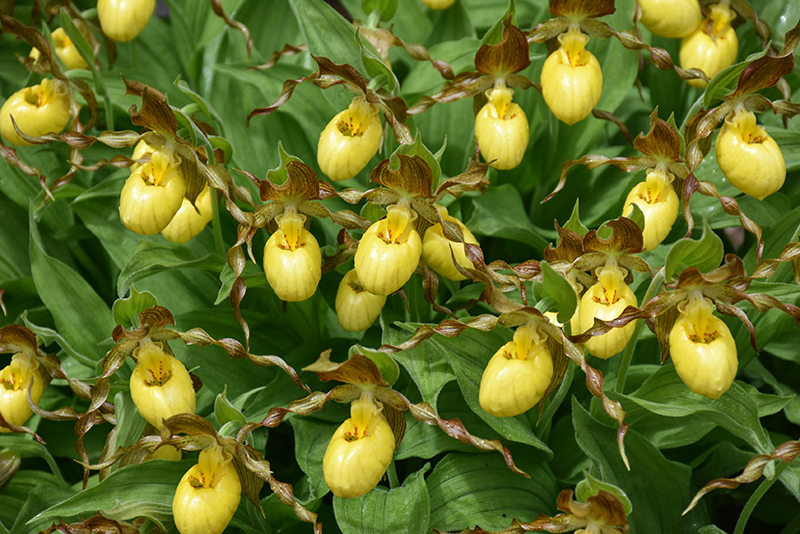 Yellow Lady's Slipper features unusual nodding lemon yellow orchid-like flowers with burgundy bracts at the ends of the stems from late spring to late summer. Its textured sword-like leaves remain emerald green in color throughout the year.