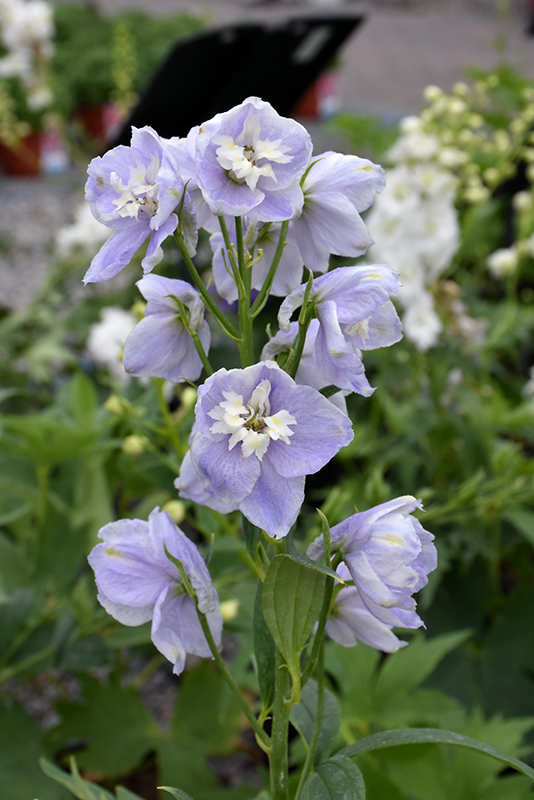 Aurora™ Lavender Larkspur will grow to be about 24 inches tall at maturity extending to 4 feet tall with the flowers, with a spread of 24 inches. When grown in masses or used as a bedding plant, individual plants should be spaced approximately 18 inches apart. It tends to be leggy, with a typical clearance of 1 foot from the ground, and should be underplanted with lower-growing perennials. The flower stalks can be weak and so it may require staking in exposed sites or excessively rich soils. It grows at a medium rate, and under ideal conditions can be expected to live for approximately 10 years. As an herbaceous perennial, this plant will usually die back to the crown each winter, and will regrow from the base each spring. Be careful not to disturb the crown in late winter when it may not be readily seen!