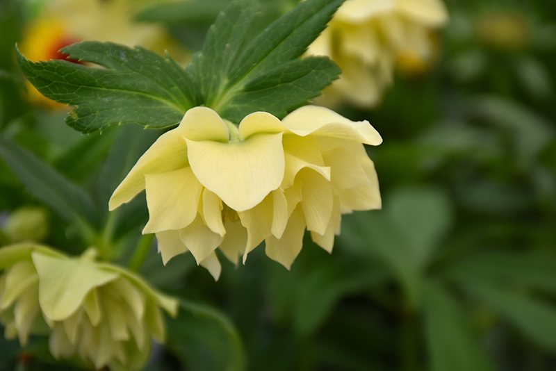 Golden Lotus Hellebore features showy nodding double gold cup-shaped flowers with chartreuse eyes and rose edges at the ends of the stems from late winter to early spring. Its glossy oval compound leaves remain bluish-green in color throughout the year.