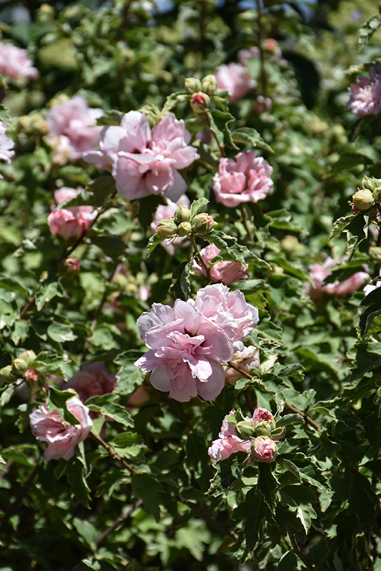 Sugar Tip® Rose of Sharon features bold double pink round flowers along the branches from mid summer to early fall. It has attractive creamy white-variegated bluish-green foliage. The lobed leaves are highly ornamental but do not develop any appreciable fall color.